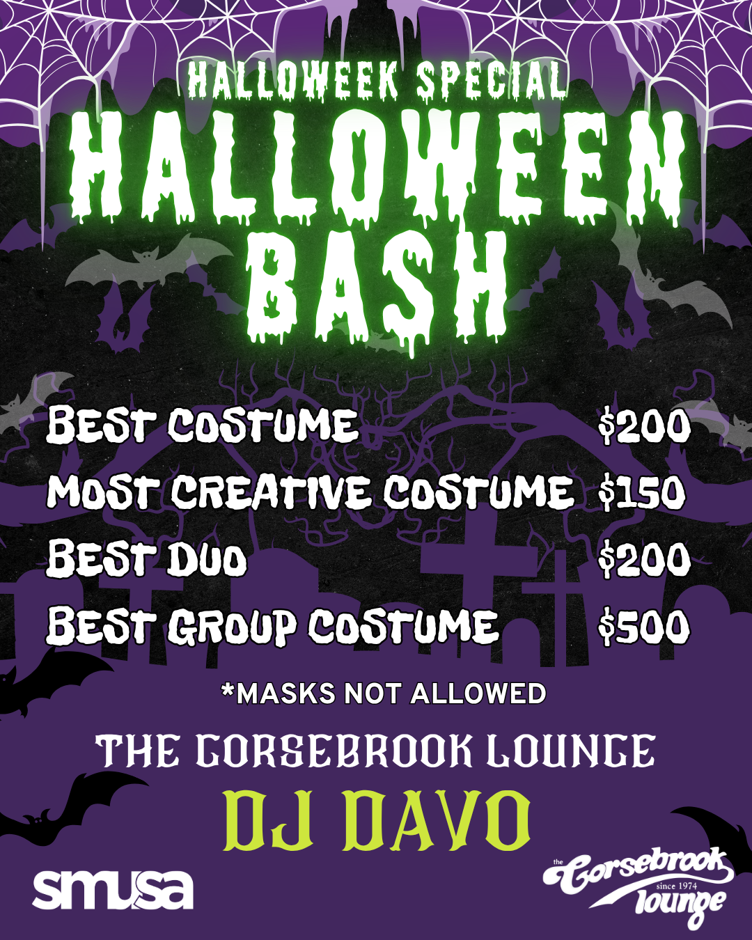 DJ Davo’s back, the costumes are wild, and the prizes are even wilder. Remember this is a 19+ event, so grab your friends, dress up, and get ready for a hauntingly good time! 👻🕸️